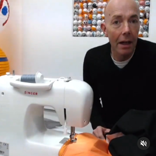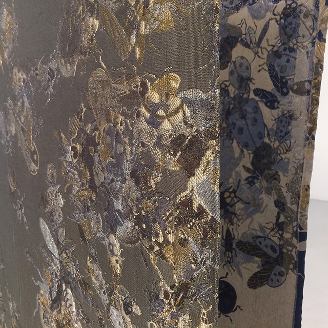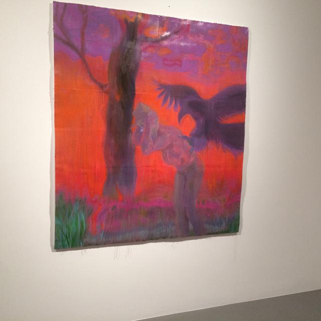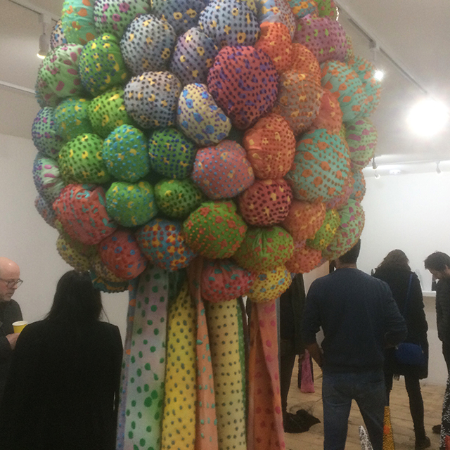 Pae White at Corvi Mora with a vivid. Embroidered, fabric artwork.