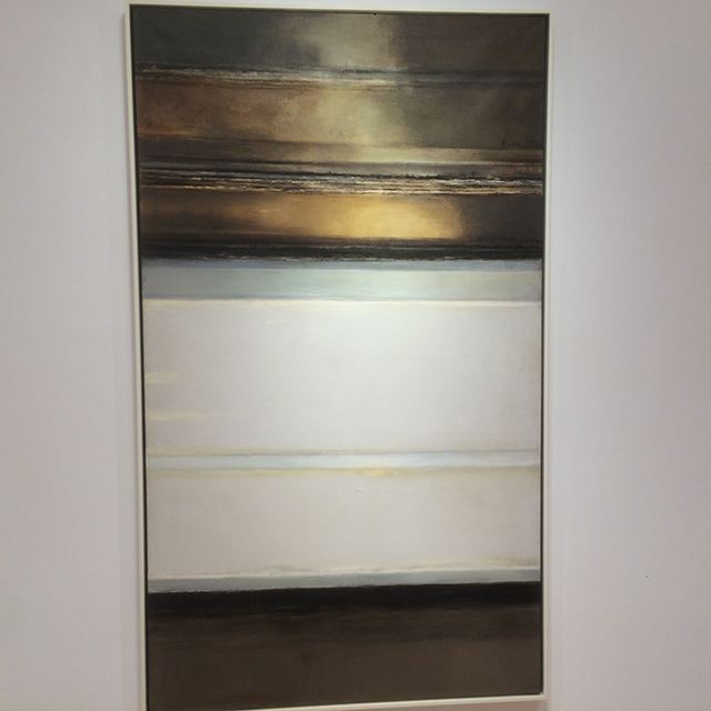 Hedda Sterne at Victoria Miro Gallery with horizontally divided paintings suggestive of seascapes with added layers to complete the composition.