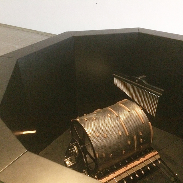 Massimo Bartolini at Frith Street Gallery with a sound organ artwork. The rotating drum yanks at pull-chords for loud blasts and catches hanging metal strips for delicate chimes.
