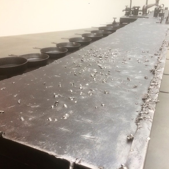 Sterling Ruby of Gagosian had commandeered huge welding tables and attached pans and faucets. The effect is a sort of romanticised blue-collar aesthetic.